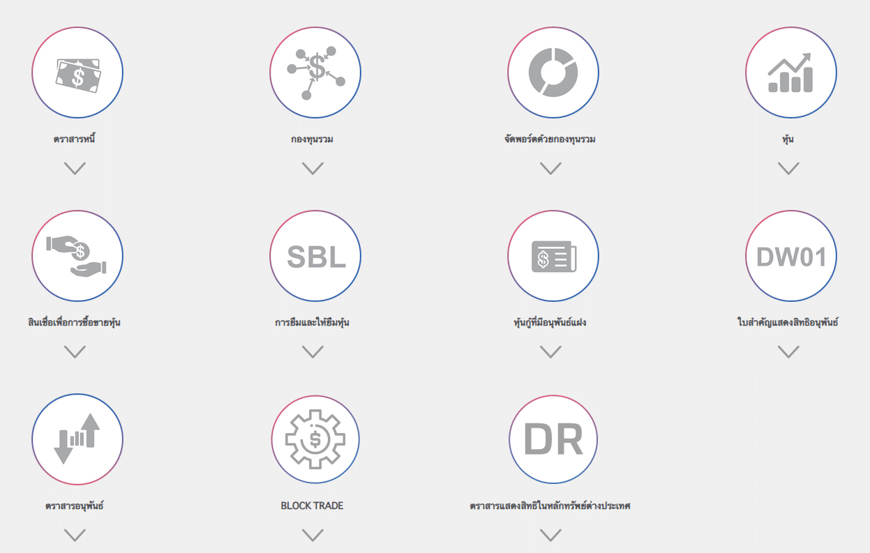 สินทรัพย์ที่ซื้อขายได้ ได้แก่ หุ้น กองทุนรวม ตราสารหนี้ หุ้นกู้ อนุพันธ์ DR หุ้นต่างประเทศ