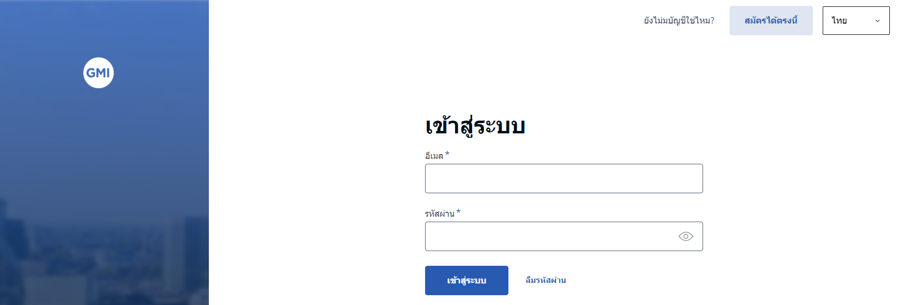 การเปิดบัญชีของ GMI Market สามารถกดเข้าได้จากปุ่ม สร้างบัญชี ที่อยู่มุมขวาบนของเว็บไซต์ หลังจากกดเข้ามาแล้วจะเข้ามาที่หน้าเข้าสู่ระบบ หากคุณยังไม่มีบัญชี กดปุ่ม สมัครได้ตรงนี้ เพื่อพาคุณไปยังหน้าสมัครเปิดบัญชี