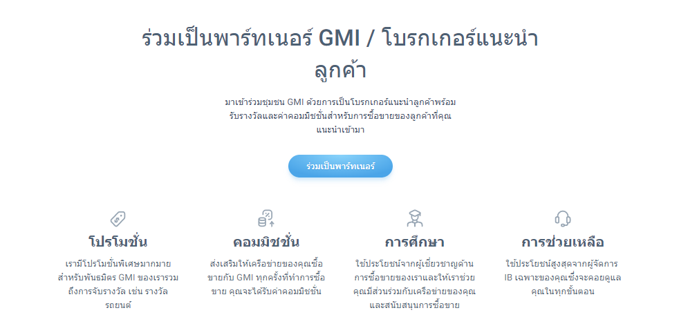 สิทธิพิเศษอีกอย่างหนึ่งคือการร่วมเป็นพาร์ทเนอร์ หรือ IB กับ GMI ซึ่งจะทำให้คุณได้รับสิทธิประโยชน์มากกว่าเทรดเดอร์ทั่วไป ตามภาพด้านล่างจะเห็นว่ามีทั้งการจับรางวัลใหญ่ ค่าคอมมิชชั่น การศึกษา รวมถึงความช่วยเหลือตลอดการเป็น IB แต่ก็ถือว่าเป็นเรื่องปกติสำหรับโบรกเกอร์ที่ควรจะมีอยู่แล้ว จึงไม่ได้โดดเด่นอะไรนักเมื่อเทียบกับบางโบรกเกอร์