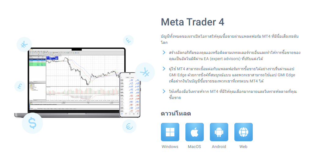 GMI Market สามารถเทรดได้บนแพลตฟอร์ม MetaTrader 4 (MT4) เหมือนกับที่หลาย ๆ โบรกเกอร์นิยมใช้ เนื่องจากเป็นแพลตฟอร์มที่มีชื่อเสียง คุณสามารถสร้างอัลกอริทึมของตัวเองได้ หรือจะติดตามเทรดเดอร์รายอื่น และปรับแต่ง EA ได้ Meta Trader 4 (MT4) มีให้ดาวน์โหลดได้ทั้ง Window MacOS Android และ Web