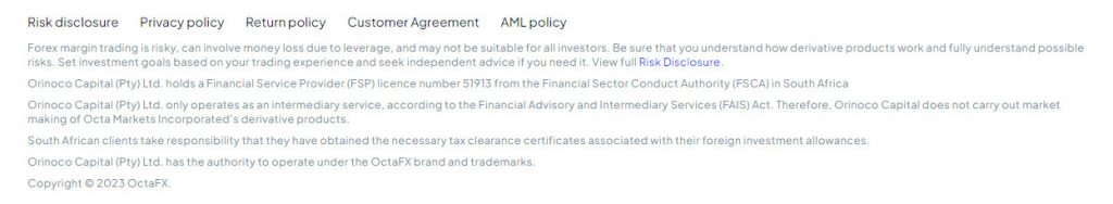 • ใบอนุญาต FSCA (Financial Sector Conduct Authority): OctaFX มีใบอนุญาตจาก FSCA หมายเลข FSP464624