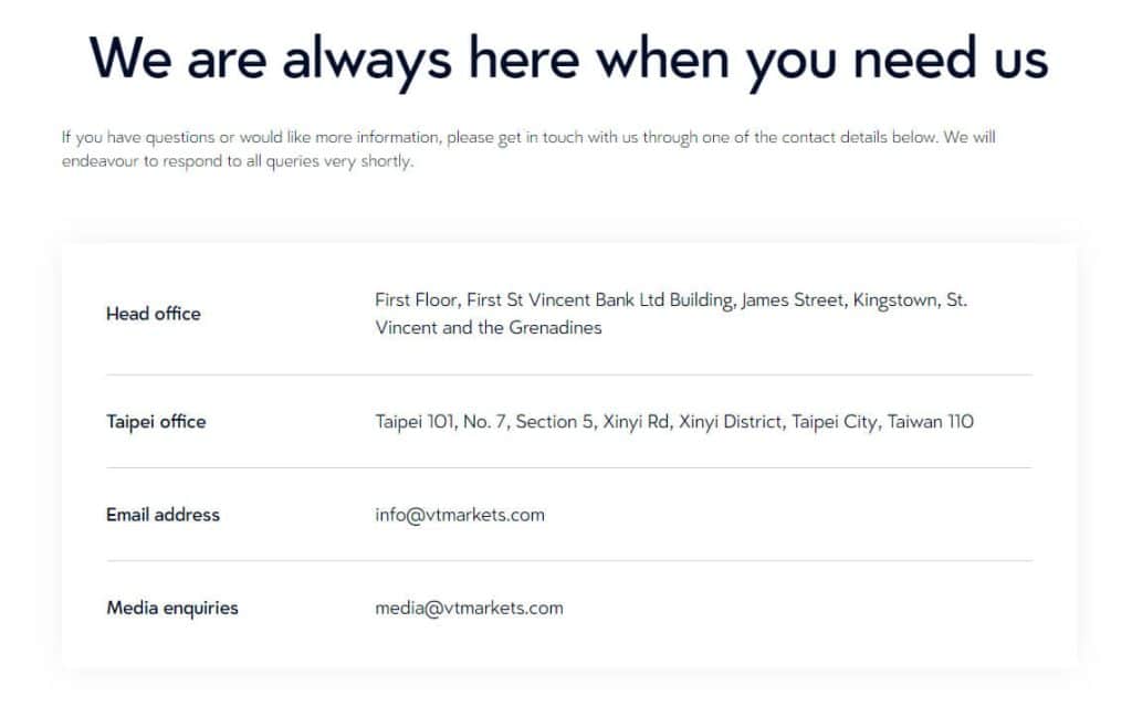 นอกเหนือจากการสนับสนุนทางอีเมลแล้ว VT Markets ยังมีสำนักงานใหญ่ในคิงส์ทาวน์ เซนต์วินเซนต์ และเกรนาดีนส์ และสำนักงานเพิ่มเติมในเมืองไทเป ประเทศไต้หวัน ที่ตั้งสำนักงานเป็นช่องทางในการติดต่อโดยตรง แม้ว่าลูกค้าต่างประเทศจะเข้าถึงได้น้อยก็ตาม