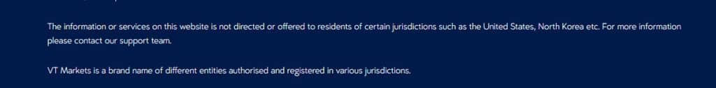 VT Markets ตั้งข้อสังเกตว่าบริการและข้อมูลของบริษัทไม่ได้ถูกกำหนดหรือให้บริการแก่ผู้อยู่อาศัยในเขตอำนาจศาลบางแห่ง รวมถึงสหรัฐอเมริกาและเกาหลีเหนือ คำแถลงบอกเป็นนัยว่าโบรกเกอร์ไม่ได้ให้บริการภายในดินแดนเหล่านี้