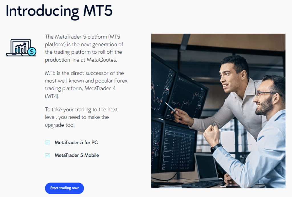 ในฐานะผู้สืบทอดของ MetaTrader 4 นั้น MetaTrader 5 (MT5) ได้นำคุณสมบัติขั้นสูงเพิ่มเข้ามาในตาราง แพลตฟอร์มเจเนอเรชั่นใหม่นี้ยังคงรักษาความคุ้นเคยของ MT4 ไว้ ในขณะเดียวกันก็นำเสนอคำสั่งซื้อขายฟอเร็กซ์ สินค้าโภคภัณฑ์ และดัชนีที่หลากหลายมากขึ้น