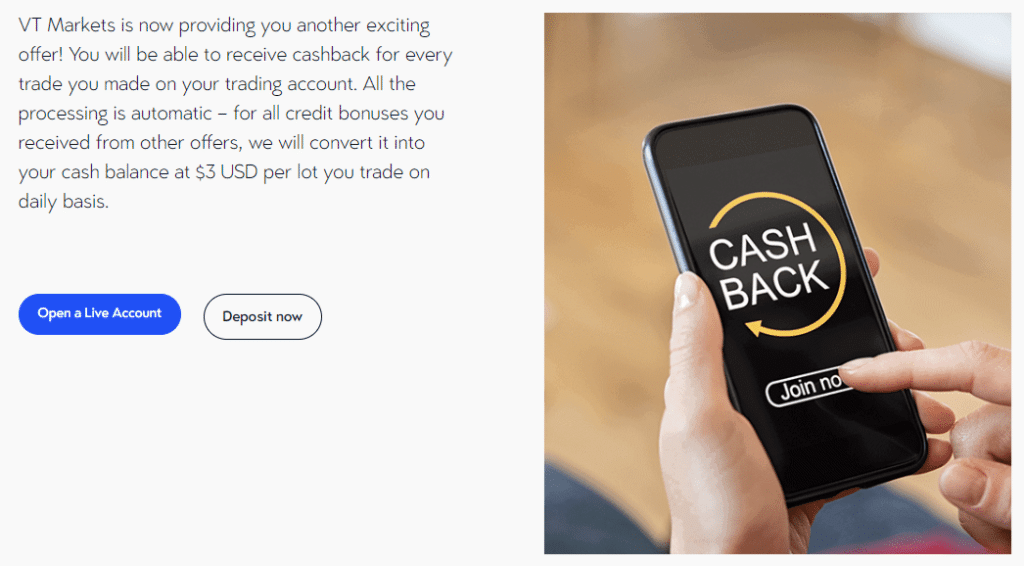 VT Markets ให้ความสำคัญกับทุกการซื้อขายของลูกค้าและเสนอเงินคืนจากการซื้อขายอัตโนมัติ โปรแกรมพิเศษนี้จะแปลงโบนัสเครดิตจากข้อเสนออื่น ๆ ให้เป็นเงินสดคงเหลือ 3 ดอลลาร์สหรัฐฯ ต่อล็อตที่ซื้อขายทุกวัน ทำให้ช่วยเพิ่มศักยภาพในการสร้างรายได้