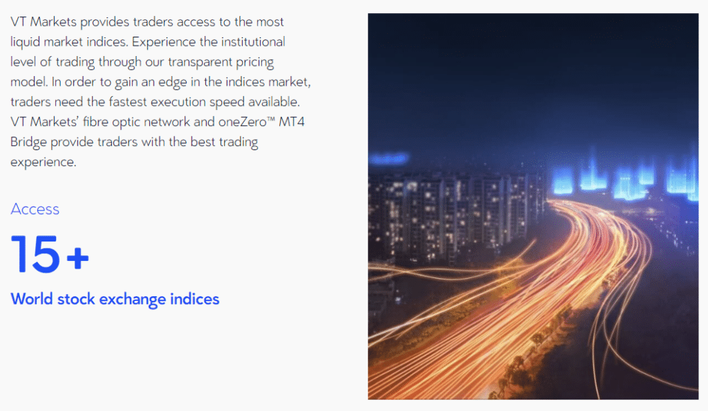 VT Markets ให้การเข้าถึงดัชนีตลาดหลักทรัพย์ที่มีสภาพคล่องมากที่สุดในโลกได้ทันทีผ่านรูปแบบการกำหนดราคาที่โปร่งใส ความสัมพันธ์ระหว่างตลาดฟอเร็กซ์และดัชนีหุ้นทำให้เทรดเดอร์มีโอกาสที่ดีเยี่ยมในการป้องกันความเสี่ยงจากสกุลเงินของตน VT Markets ให้เลเวอเรจสูงถึง 500:1 สำหรับดัชนี ช่วยให้เทรดเดอร์สามารถเพิ่มผลกำไรสูงสุดได้