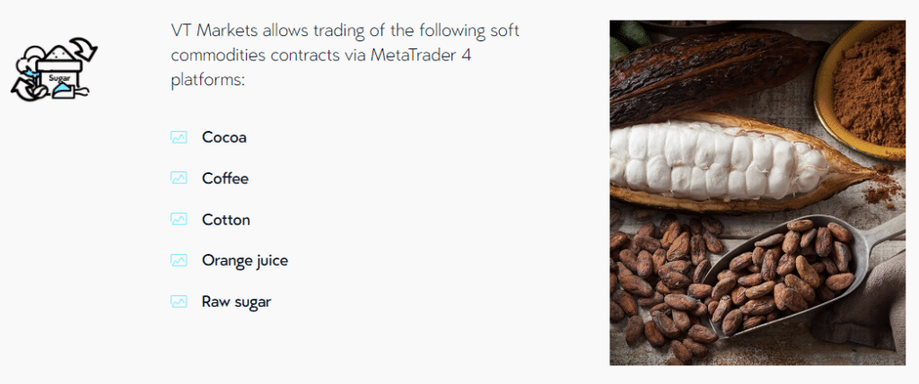 VT Markets ช่วยให้เทรดเดอร์สามารถเข้าถึงสินค้าโภคภัณฑ์ซึ่งหมายถึงสินค้าที่ปลูก เช่น โกโก้ กาแฟ ฝ้าย น้ำส้ม และน้ำตาลดิบ ตลาดนี้เสนอโอกาสในการเก็งกำไรมากมาย ในขณะเดียวกันก็เป็นเครื่องมือป้องกันความเสี่ยงที่สำคัญสำหรับเกษตรกรจากภัยพิบัติทางธรรมชาติ