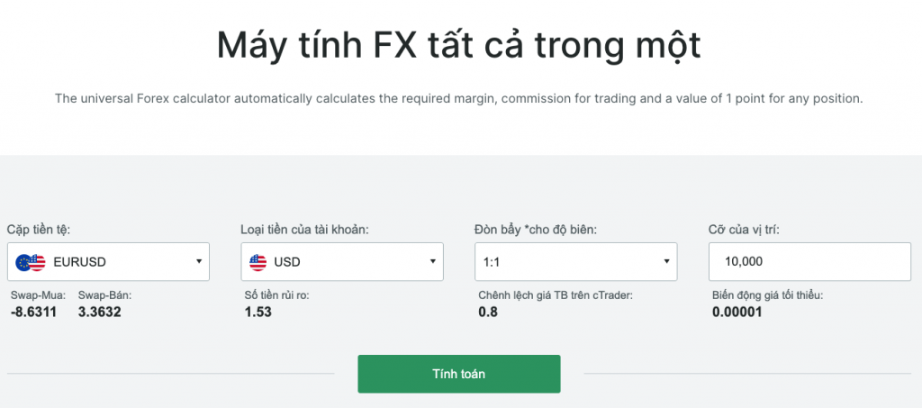 Với máy tính FXPro, bạn có thể tính toán các thông số bao gồm ký quỹ được yêu cầu, hoa hồng cho mỗi giao dịch cũng như các giá trị point, pip,… cho bất kỳ vị thế nào.