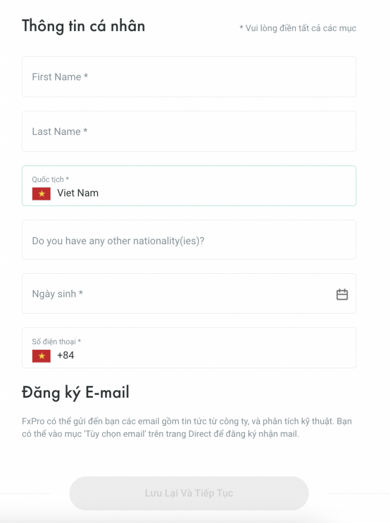 Sau đó, màn hình sẽ dẫn bạn đến trang để điền các thông tin cá nhân, bạn điền đầy đủ và sau đó nhấn “Lưu lại và tiếp tục”.