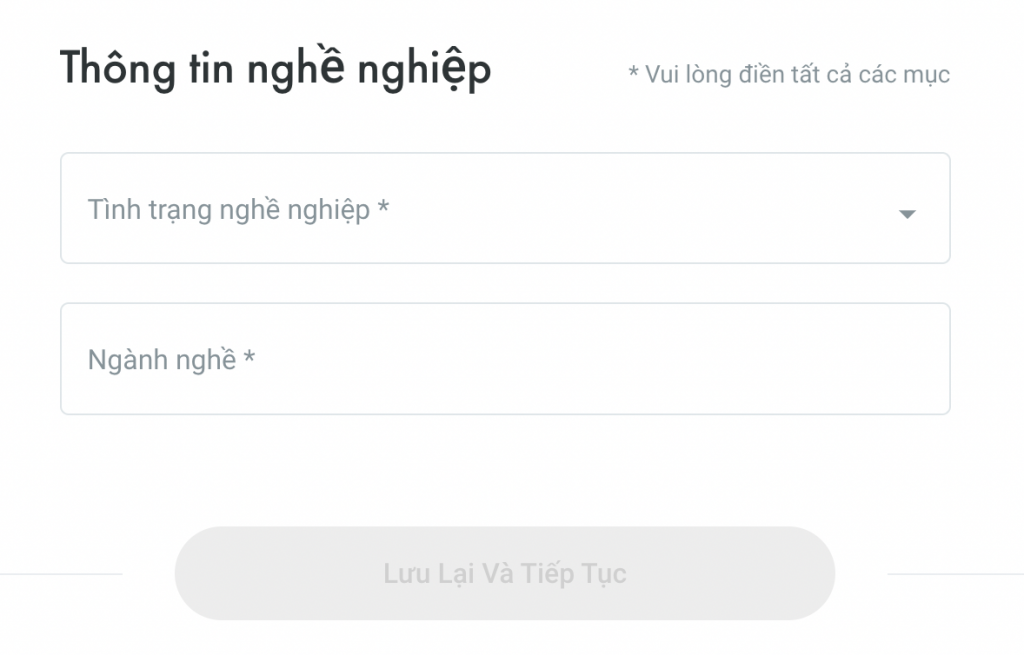 Điền “thông tin về nghề nghiệp”, sau đó nhấn “Lưu lại và Tiếp tục”.