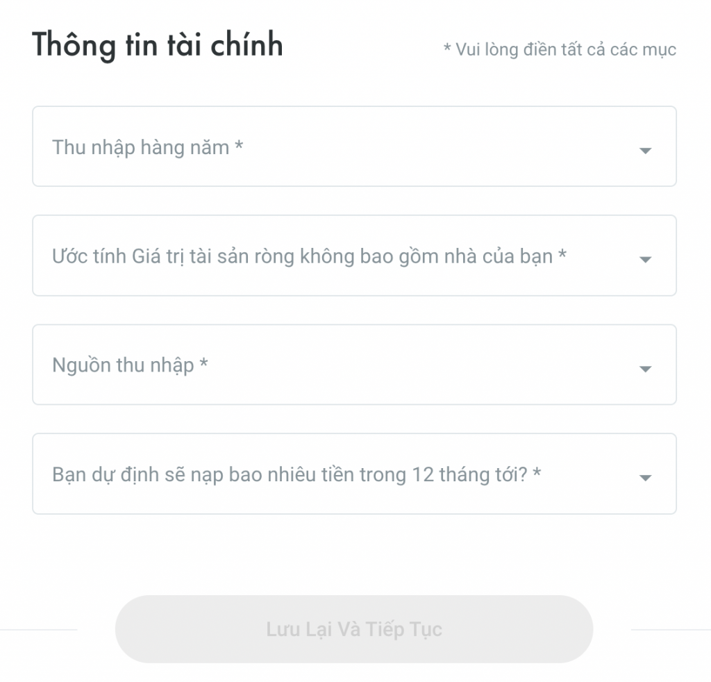 Rồi, điền thông tin về tài chính, nhấn “Lưu lại và Tiếp tục”.