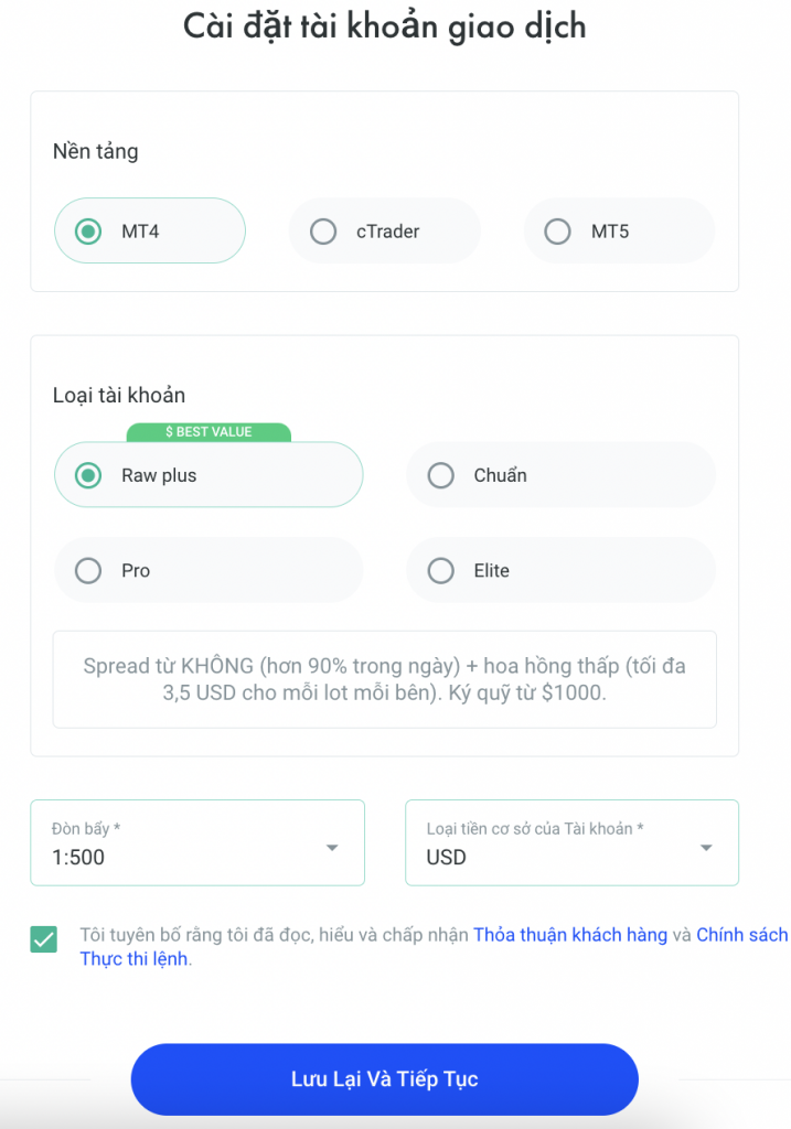 Tiếp đến, bạn được yêu cầu chọn các tùy chọn về tài khoản giao dịch, nhấn “Lưu lại và Tiếp tục”.