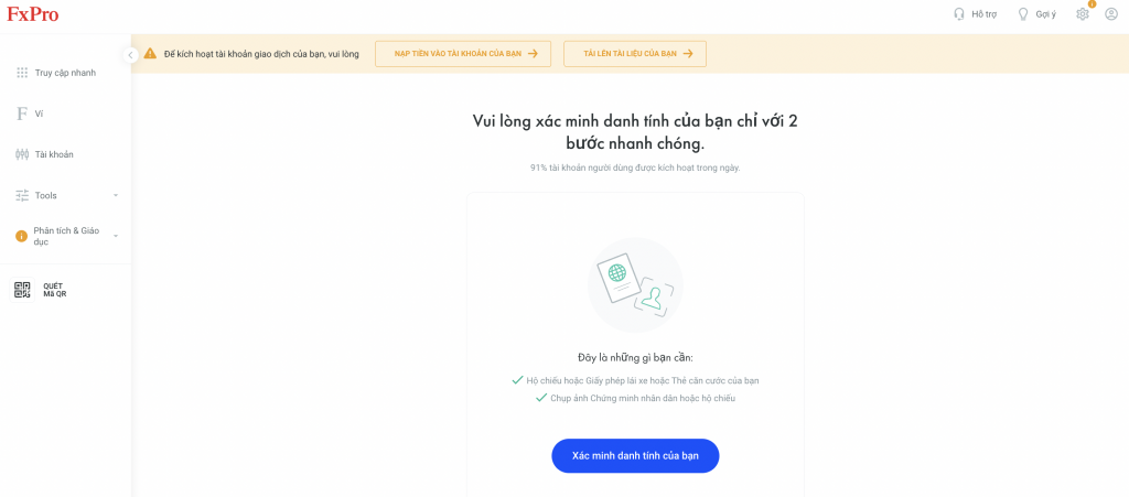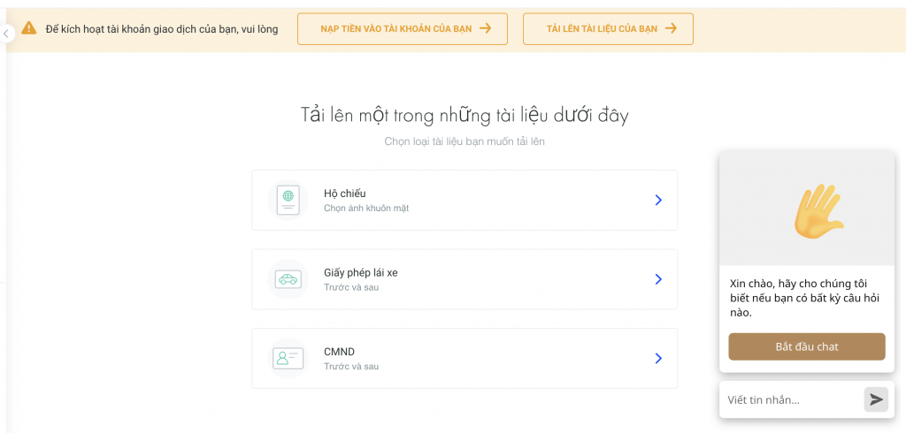 Kế tiếp, bạn được yêu cầu xác minh danh tính bằng việc tải lên một trong các tài liệu cần thiết như hộ chiếu, giấy phép lái xe hoặc CMND. Lưu ý rằng để có thể kích hoạt tài khoản giao dịch, bạn cần tải lên tài liệu như chúng tôi vừa đề cập hoặc nạp tiền vào tài khoản của bạn.