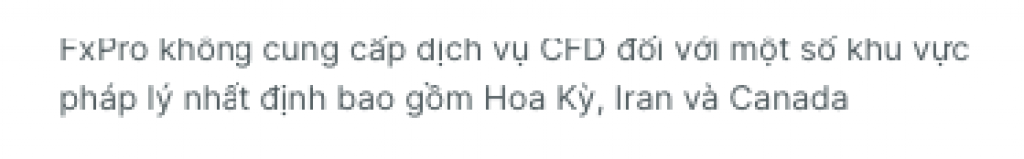 Tại trang chủ, bạn kéo xuống chân trang (Footer) sẽ thấy dòng chữ mà FXPro đề cập rằng họ không cung cấp dịch vụ cho các quốc gia Hoa Kỳ, Iran và Canada. Thường thì một số nhà môi giới khác sẽ không cung cấp cho cả những nước đang bị trừng phạt. Tuy nhiên, để biết chắc chắn rằng liệu quốc gia bạn đang sinh sống có thuộc danh sách bị cấm giao dịch từ FXPro hay không, bạn có thể biết được thông qua việc lựa chọn trong quá trình đăng ký tài khoản.