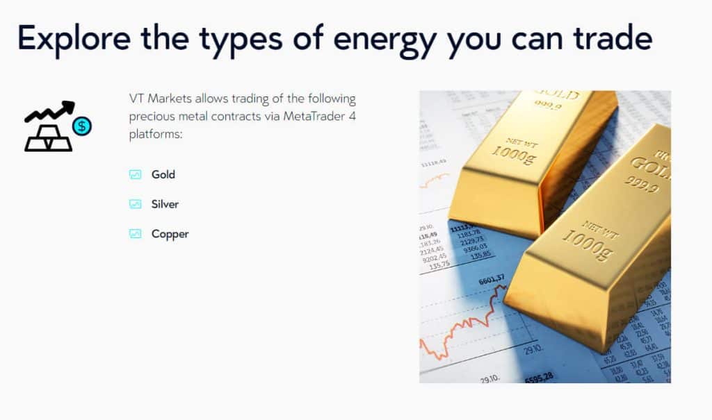 Các kim loại quý, chẳng hạn như vàng, bạc và đồng, được nhiều người coi là kho lưu trữ giá trị. Chúng được coi là nơi trú ẩn an toàn trong thời kỳ kinh tế hỗn loạn và có thể dễ dàng dự đoán được sự biến động giá của các sản phẩm này. Tại VT Markets, các nhà giao dịch có thể khai thác tiềm năng này bằng cách giao dịch các thị trường kim loại quý thông qua nền tảng MT4.