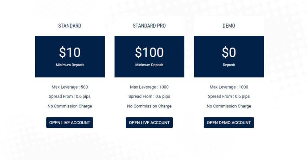 - Account types: Standard, Standard Pro, and Demo accounts