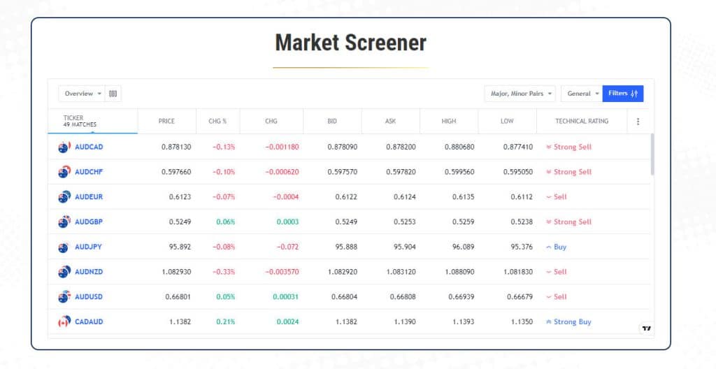 The market screener available on the platform offers a current breakdown of Forex pairs. This can be useful for traders looking for specific currency pairs to trade, but it does not provide advanced screening capabilities or detailed analysis of individual pairs.