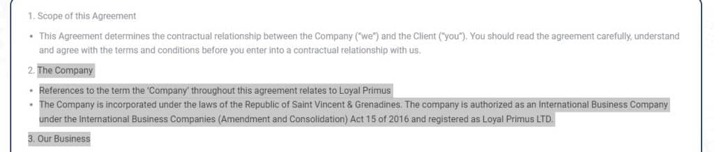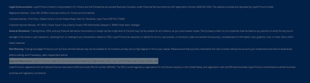 Loyal Primus is incorporated under the Republic of Saint Vincent & Grenadines laws and operates as an International Business Company, registered as Loyal Primus LTD. To gain insights into the broker’s regulations and policies, you can visit the “terms of business” link located in the main header menu under the “about us” section on their website. This section provides detailed information regarding the broker’s operational guidelines, terms, and conditions, empowering you to make informed decisions.