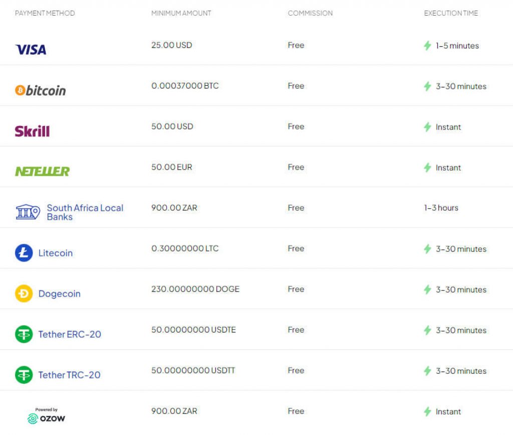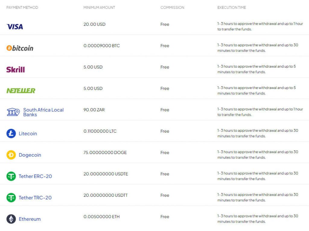 Ada persyaratan setoran minimum yang berbeda untuk setiap metode, tetapi ingat bahwa jumlah minimum untuk setiap akun untuk trading adalah 100 USD. Terkadang bisa sedikit membingungkan. Tidak ada komisi yang dikenakan saat deposit atau withdrawal, seperti broker terkemuka lainnya.
