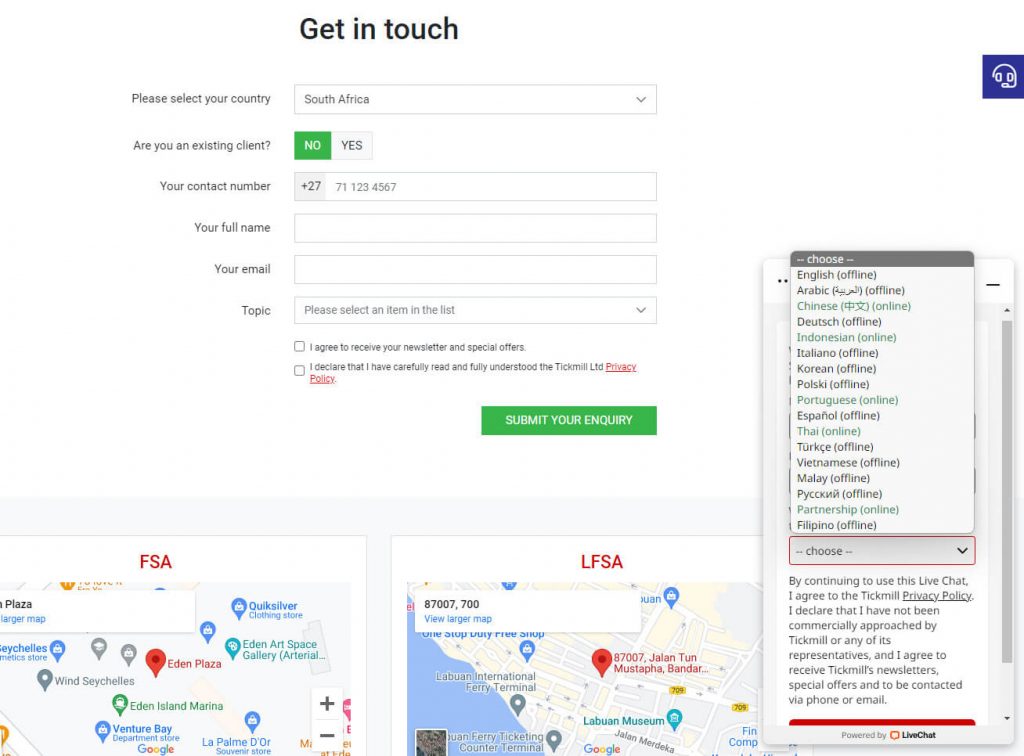 One thing about Tickmill is that their customer service section is one of the most robust we have come across. Heading to the “contact us” section of the site, you will find information on the broker’s three offices. These are situated in South Africa, Malaysia, and Seychelles. Everything from their regulation and license number to the company registration number and Google maps is available.
