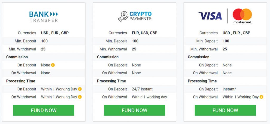 The minimum for deposits for most methods is about 100 USD or the equivalent in other currencies. Remember that the account types don’t have a minimum balance requirement, but you will need to deposit 100 USD each time you make a payment. The methods for deposits are;
