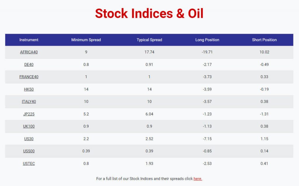 Moving to the indices section, we find the layout to be the same, where they explain what indices are and then give you a short table of which are available with a link to their entire list. For some reason, they put “oil” in the heading with indices; however, oil is a commodity or “energy,” and looking at the assets list for indices, it is not included here.