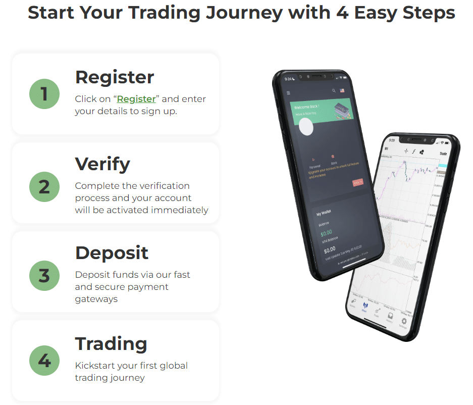 You simply follow the steps to complete the verification process, submit your identity documents and wait for the verification result, then deposit and start trading.