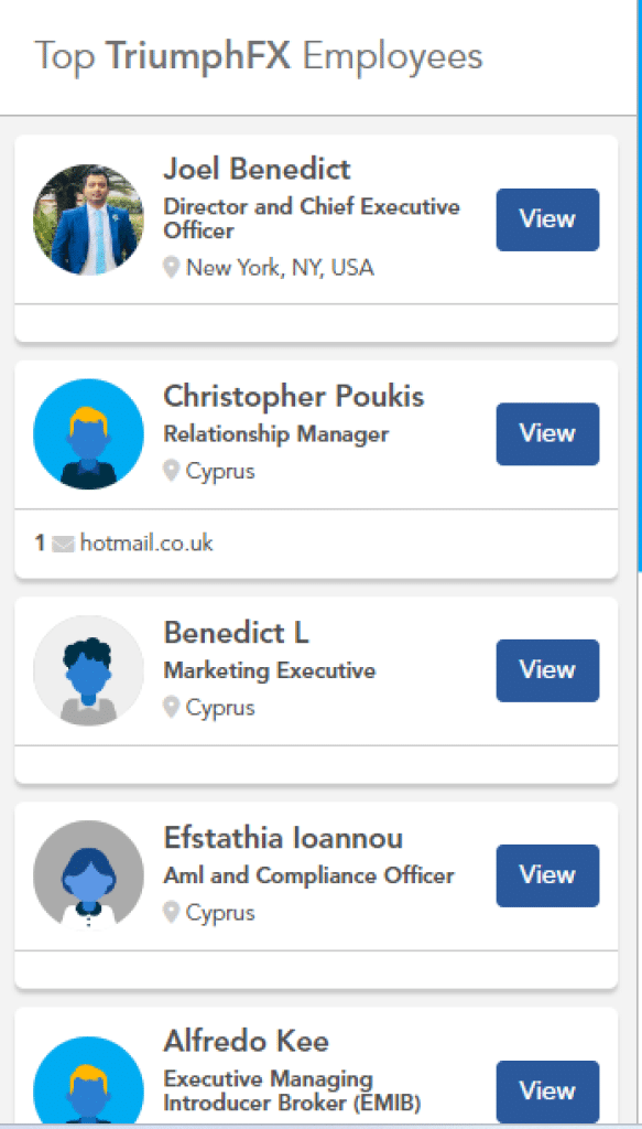 If there’s any confusion as to the three names mentioned above, it’s fair to point out that the owner of all three is TriumphFX International Limited. This financial firm holds the CySEC license number 293/16. In terms of who the owner of TriumphFX is, no clear cut answer has been made available. However, the latest Director and Chief Executive Officer is Joel Benedict.