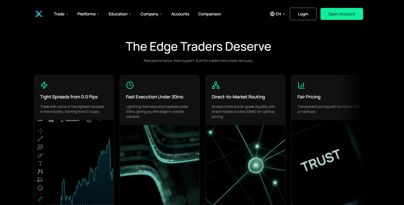 Giá chênh lệch thấp, chênh lệch bắt đầu từ 0.2 pips, thực hiện lệnh nhanh 1:3000, đòn bẩy cao, thanh khoản cao.